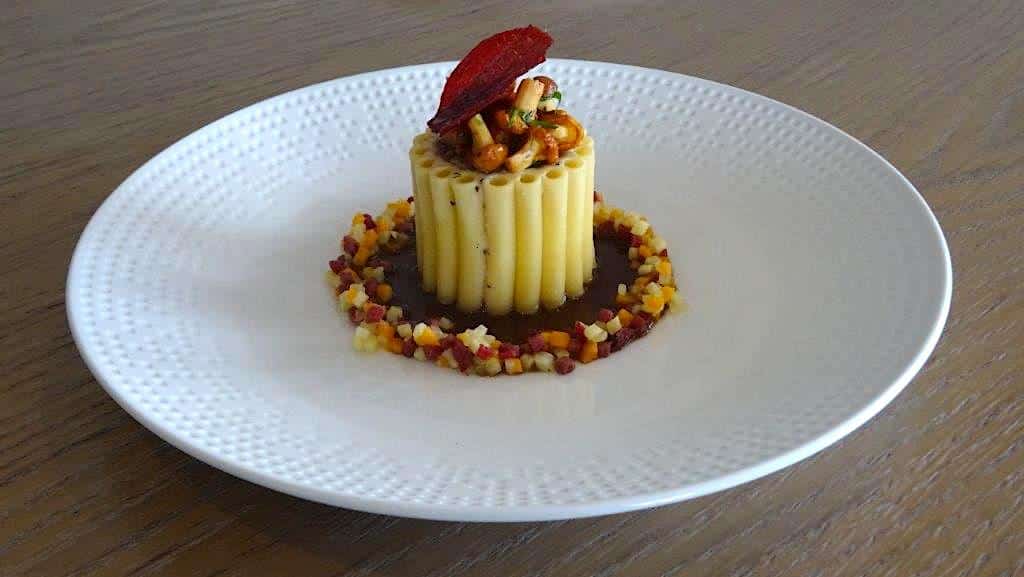 De cette façon, la farce fine sur les macaronis, le confit d’agneau et les macaronis resteront moelleux. Avant l’envoi, placer sur chacune des Chartreuse les petites girolles.