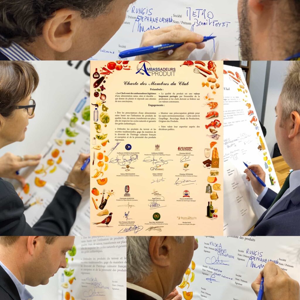 C’est dans ce contexte que la Charte «Ambassadeurs du Produit », qui a été signée la semaine précédente par les associations culinaires au sein du Club et qui donne vie à un formidable levier d’influences mis à la disposition de la communauté des chefs cuisiniers, a également été signée par monsieur Stéphane Layani (Président Directeur Général du Marché International de Rungis), monsieur Benoit Feytit (Directeur Général chez METRO France), madame Christiane Lambert (Présidente de la FNSEA), monsieur Guillaume Lefort (Président d’Agridemain), monsieur Jean-Baptiste Lemoyne (Secrétaire d’État auprès du ministre de l’Europe et des Affaires Étrangères), monsieur Eric Fouguet (Président de Chez Vous TV).